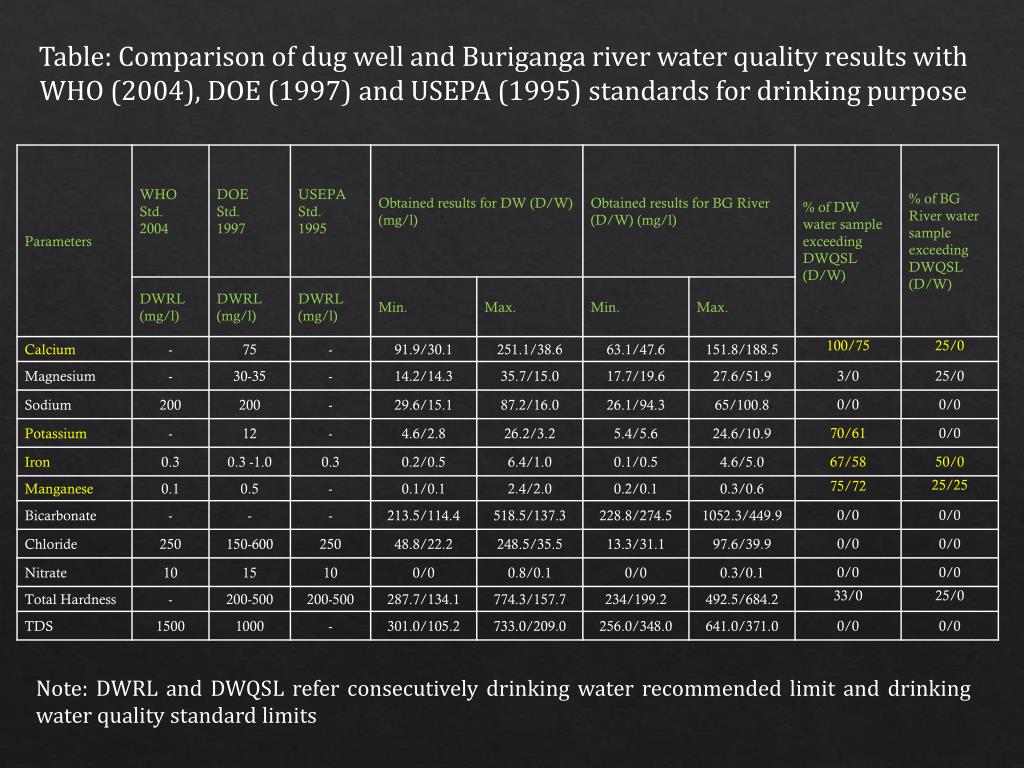 Table: Comparison of dug well and Buriganga river water quality results with • WHO (2004), DOE (1997) and USEPA (1995) standards for drinking purpose Note: DWRL and DWQSL refer consecutively drinking water recommended limit and drinking water quality standard limits