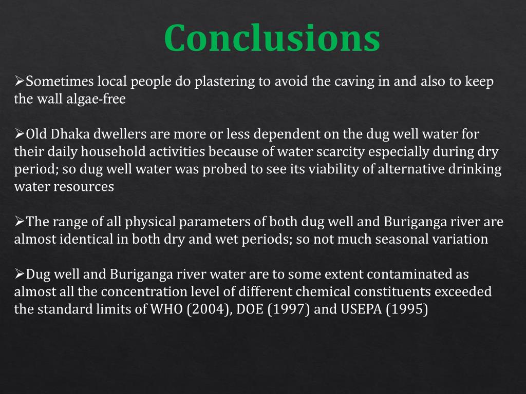 Conclusions • Sometimes local people do plastering to avoid the caving in and also to keep the wall algae-free • Old Dhaka dwellers are more or less dependent on the dug well water for their daily household activities because of water scarcity especially during dry period; so dug well water was probed to see its viability of alternative drinking water resources • The range of all physical parameters of both dug well and Buriganga river are almost identical in both dry and wet periods; so not much seasonal variation • Dug well and Buriganga river water are to some extent contaminated as almost all the concentration level of different chemical constituents exceeded the standard limits of WHO (2004), DOE (1997) and USEPA (1995)
