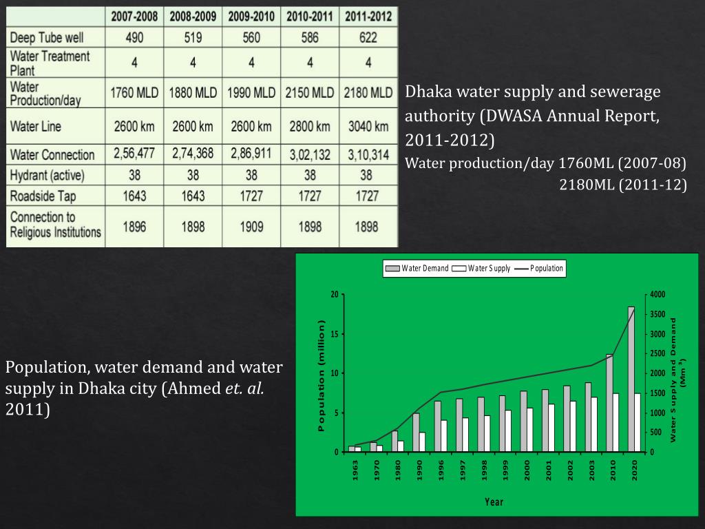 Dhaka water supply and sewerage authority (DWASA Annual Report, 2011-2012) Water production/day 1760ML (2007-08) 2180ML (2011-12) Population, water demand and water supply in Dhaka city (Ahmed et. al. 2011)