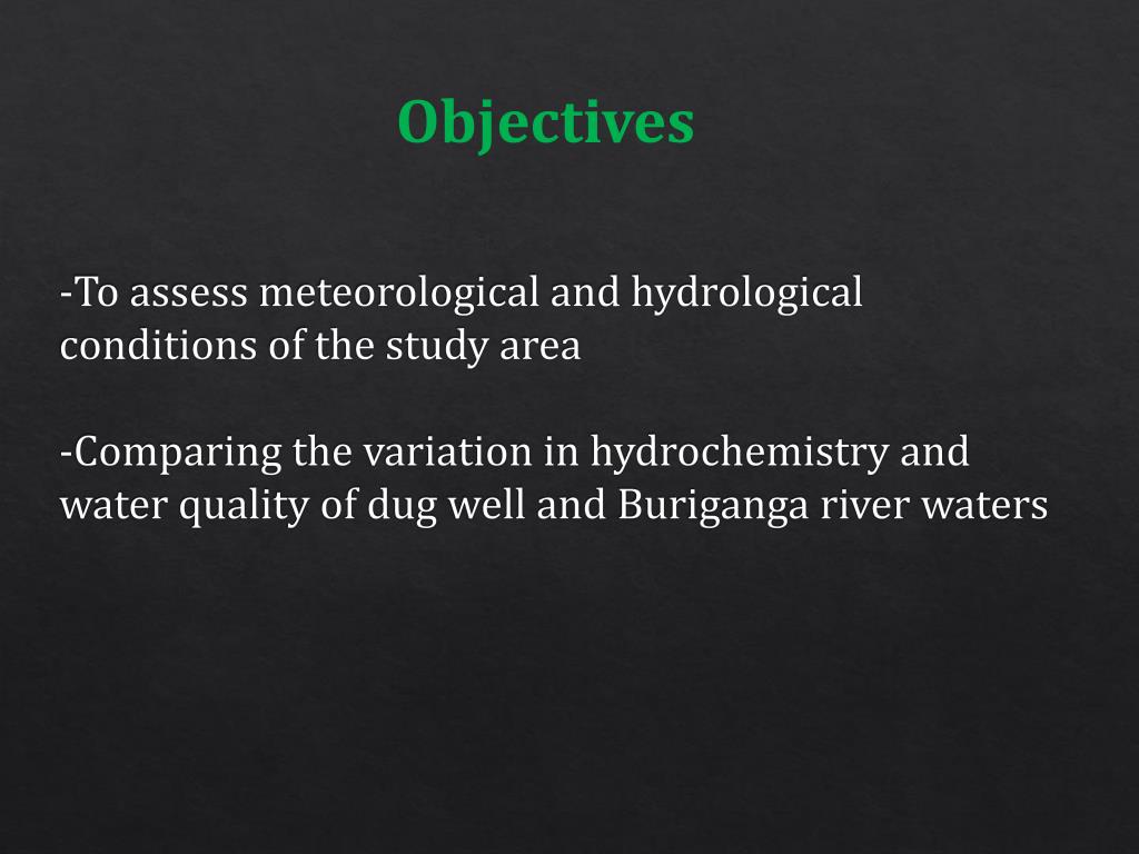 -To assess meteorological and hydrological conditions of the study area-Comparing the variation in hydrochemistry and water quality of dug well and Buriganga river waters Objectives
