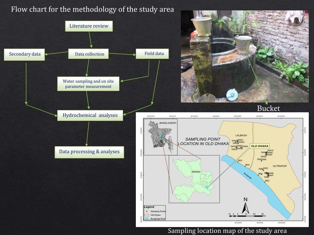 Literature review Secondary data Data collection Field data Water sampling and on site parameter measurement Hydrochemicalanalyses Data processing& analyses Flow chart for the methodology of the study area Bucket Sampling location map of the study area