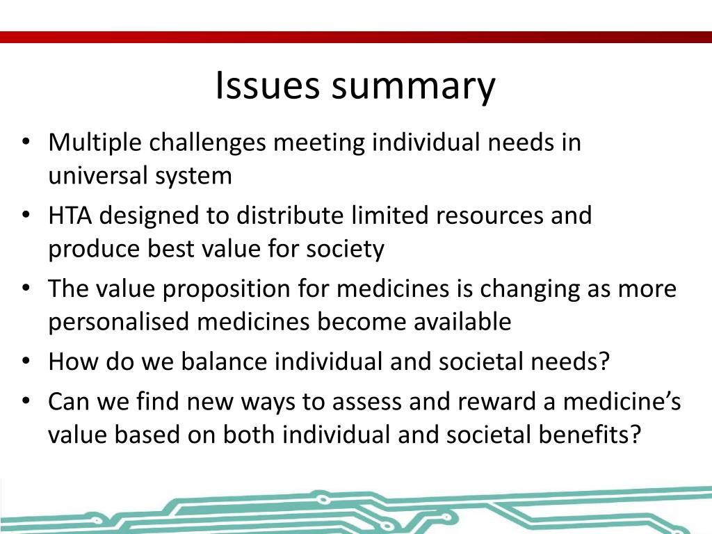 Issues summary • Multiple challenges meeting individual needs in universal system • HTA designed to distribute limited resources and produce best value for society • The value proposition for medicines is changing as more personalised medicines become available • How do we balance individual and societal needs? • Can we find new ways to assess and reward a medicine’s value based on both individual and societal benefits?