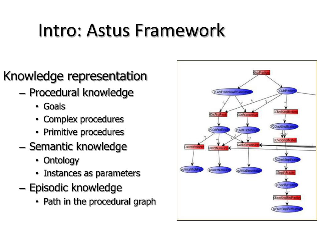 Knowledge representation Procedural knowledge Goals Complex procedures Primitive procedures Semantic knowledge Ontology Instances as parameters Episodic knowledge Path in the procedural graph Intro: Astus Framework