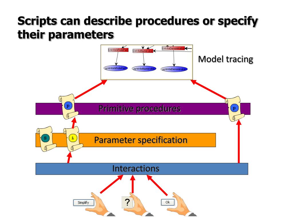 Scripts candescribeprocedures or specifytheirparameters Model tracing Primitive procedures Parameter specification Interactions