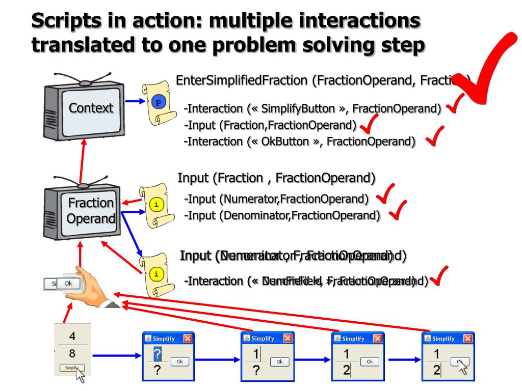 Scripts in action: multiple interactions translated to one problemsolvingstep EnterSimplifiedFraction (FractionOperand, Fraction) Context -Interaction (« SimplifyButton », FractionOperand) -Input (Fraction,FractionOperand) -Interaction (« OkButton », FractionOperand) Input (Fraction , FractionOperand) -Input (Numerator,FractionOperand) Fraction Operand -Input (Denominator,FractionOperand) Input (Numerator , FractionOperand) Input (Denominator , FractionOperand) -Interaction (« DenomField », FractionOperand) -Interaction (« NumField », FractionOperand)