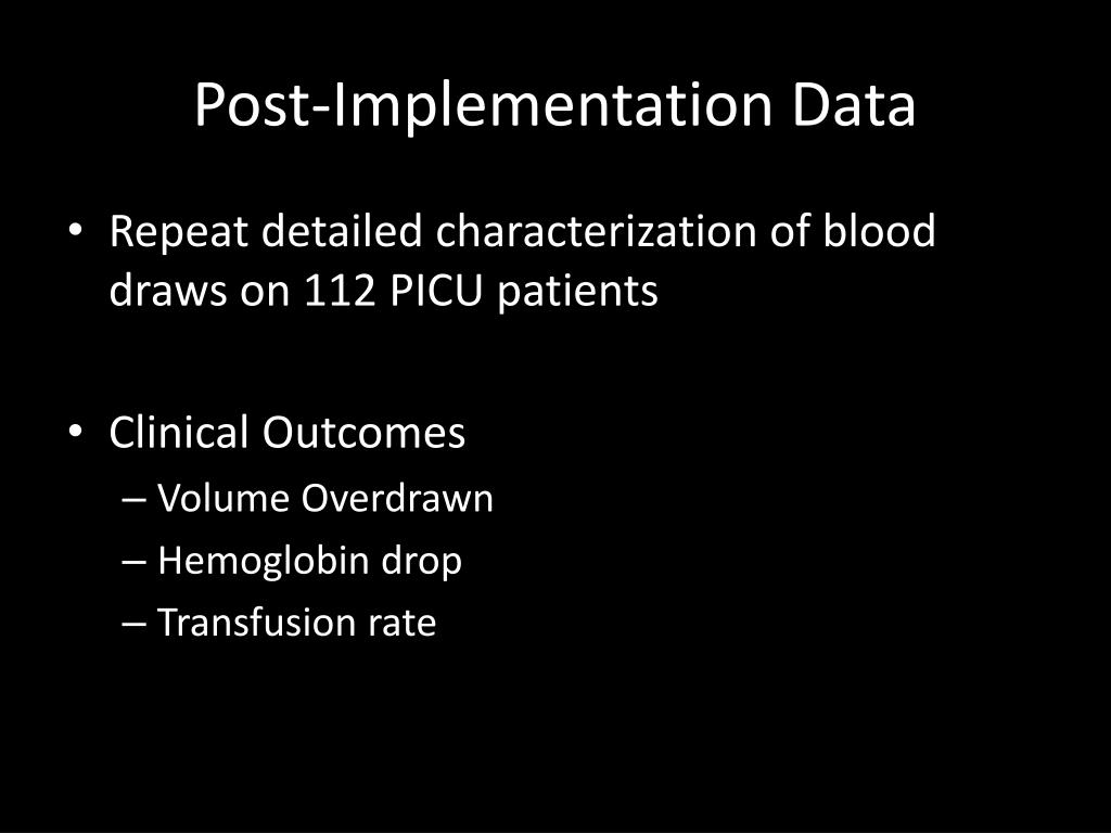 Post-Implementation Data • Repeat detailed characterization of blood draws on 112 PICU patients • Clinical Outcomes • Volume Overdrawn • Hemoglobin drop • Transfusion rate