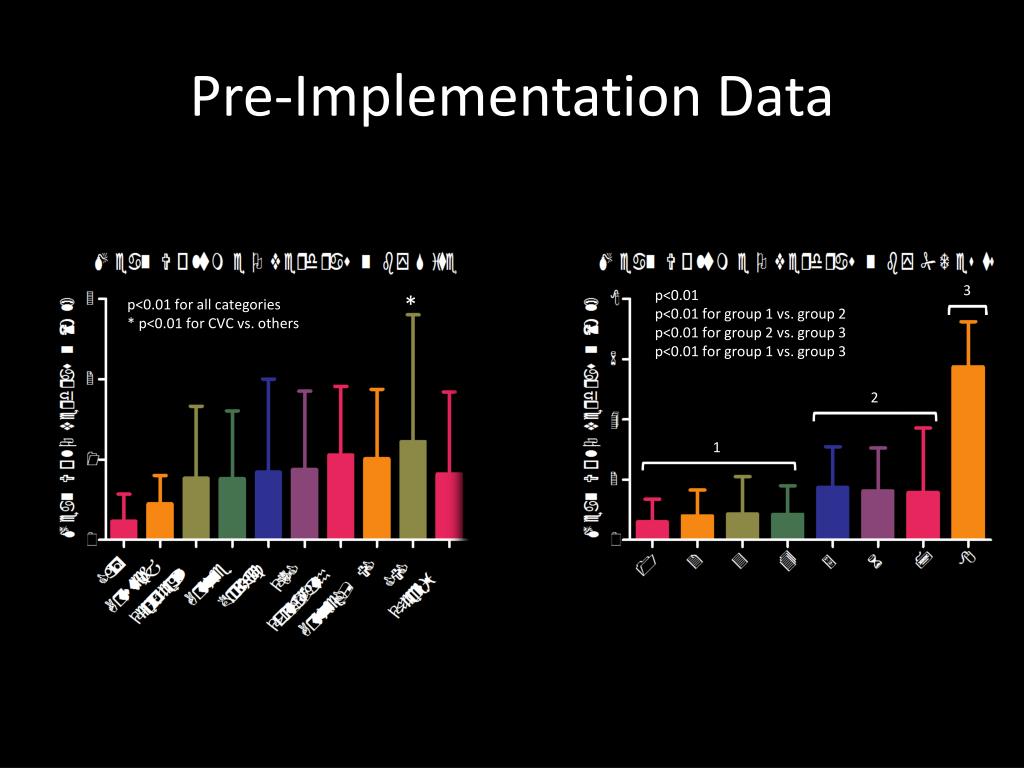 Pre-Implementation Data 3 p<0.01 p<0.01 for group 1 vs. group 2 p<0.01 for group 2 vs. group 3 p<0.01 for group 1 vs. group 3 * p<0.01 for all categories * p<0.01 for CVC vs. others 2 1