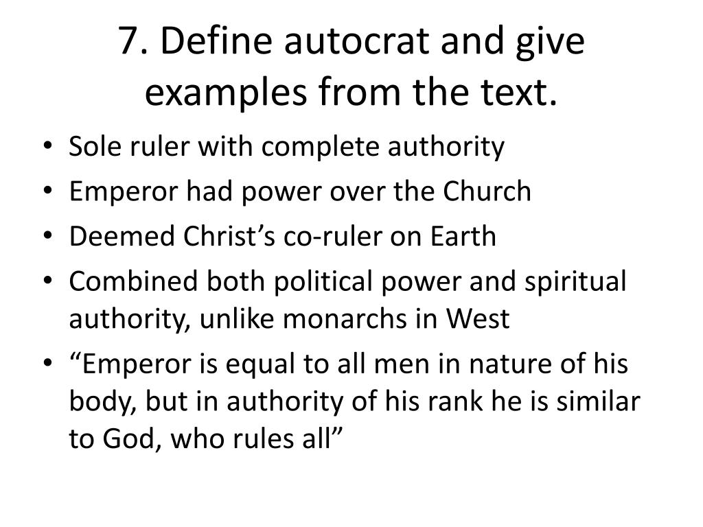 7. Define autocrat and give examples from the text. • Sole ruler with complete authority • Emperor had power over the Church • Deemed Christ’s co-ruler on Earth • Combined both political power and spiritual authority, unlike monarchs in West • “Emperor is equal to all men in nature of his body, but in authority of his rank he is similar to God, who rules all”