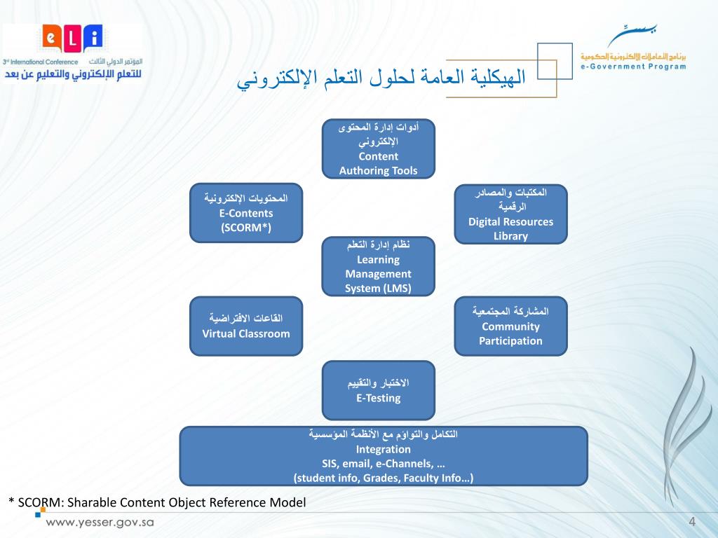 أدوات إدارة المحتوى الإلكتروني Content Authoring Tools الهيكلية العامة لحلول التعلم الإلكتروني المحتويات الإلكترونية E-Contents (SCORM*) المكتبات والمصادر الرقمية Digital Resources Library نظام إدارة التعلم Learning Management System (LMS) القاعات الافتراضية Virtual Classroom المشاركة المجتمعية Community Participation الاختبار والتقييم E-Testing * SCORM: Sharable Content Object Reference Model التكامل والتواؤم مع الأنظمة المؤسسية Integration SIS, email, e-Channels, … (student info, Grades, Faculty Info…)