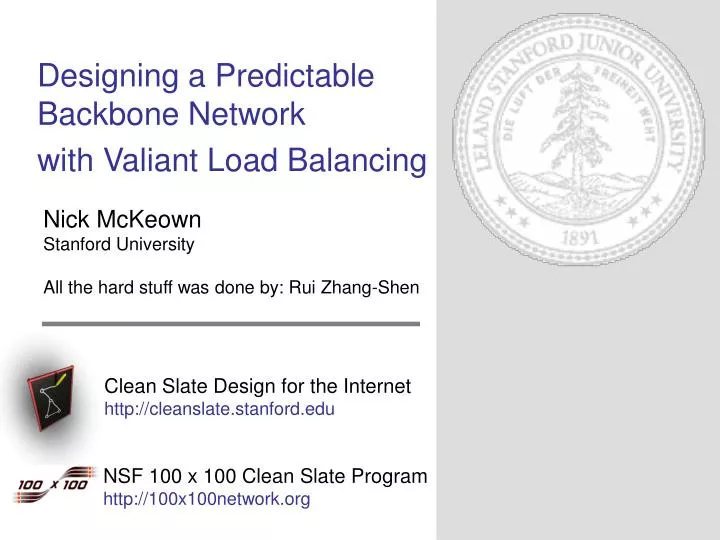 Designing a Predictable Backbone Network with Valiant Load Balancing. Nick McKeown Stanford University All the hard stuff was done by: Rui Zhang-Shen. Clean Slate Design for the Internet http://cleanslate.stanford.edu. NSF 100 x 100 Clean Slate Program http://100x100network.org. 2. 1. 3.