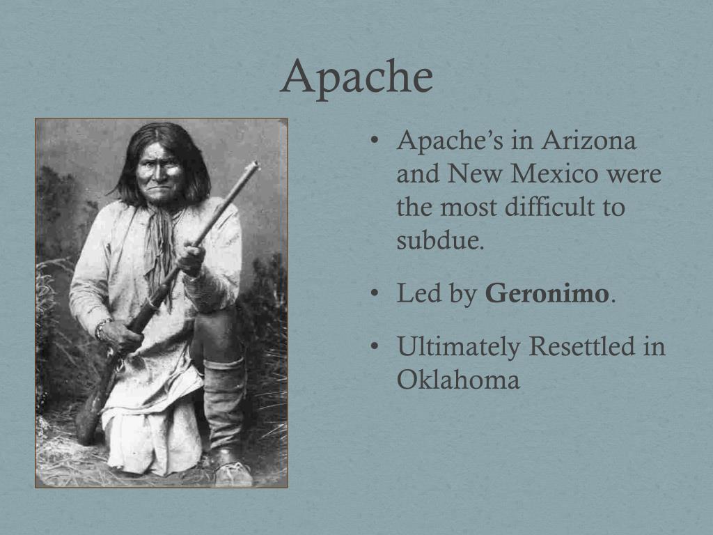 Apache • Apache’s in Arizona and New Mexico were the most difficult to subdue. • Led by Geronimo. • Ultimately Resettled in Oklahoma