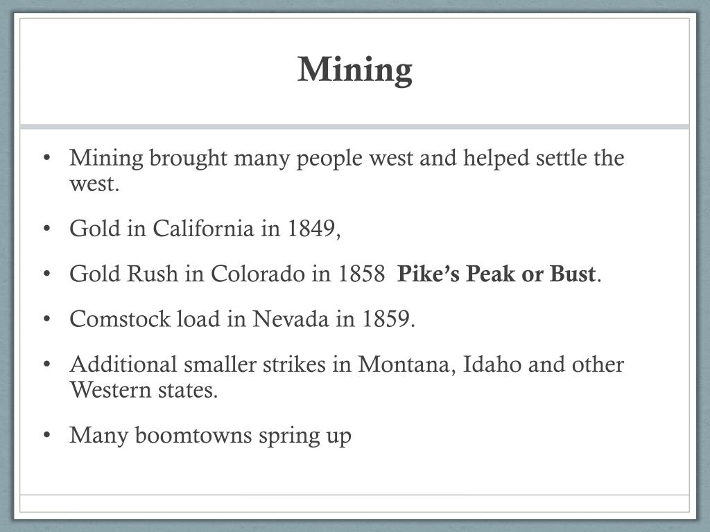 Mining • Mining brought many people west and helped settle the west. • Gold in California in 1849, • Gold Rush in Colorado in 1858 Pike’s Peak or Bust. • Comstock load in Nevada in 1859. • Additional smaller strikes in Montana, Idaho and other Western states. • Many boomtowns spring up