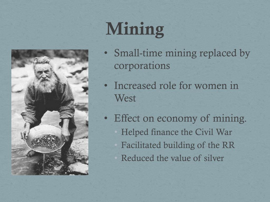 Mining • Small-time mining replaced by corporations • Increased role for women in West • Effect on economy of mining. • Helped finance the Civil War • Facilitated building of the RR • Reduced the value of silver