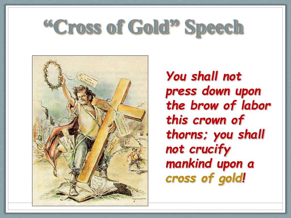 “Cross of Gold” Speech You shall not press down upon the brow of labor this crown of thorns; you shall not crucify mankind upon across of gold!