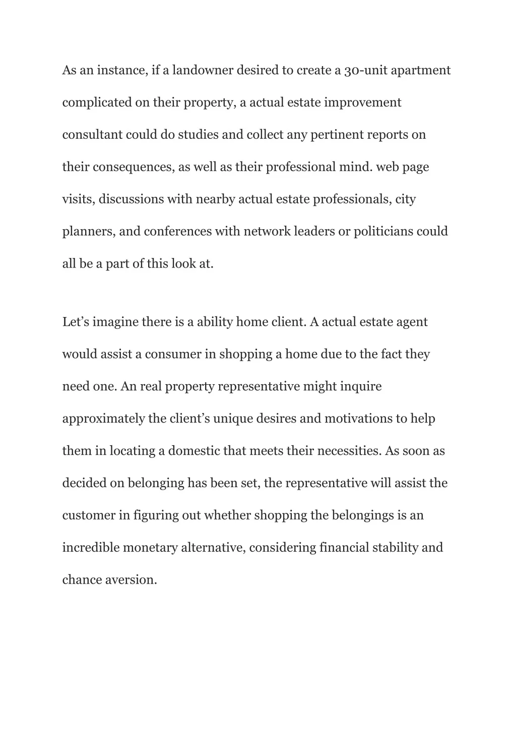 As an instance, if a landowner desired to create a 30-unit apartment complicated on their property, a actual estate improvement consultant could do studies and collect any pertinent reports on their consequences, as well as their professional mind. web page visits, discussions with nearby actual estate professionals, city planners, and conferences with network leaders or politicians could all be a part of this look at. Let’s imagine there is a ability home client. A actual estate agent would assist a consumer in shopping a home due to the fact they need one. An real property representative might inquire approximately the client’s unique desires and motivations to help them in locating a domestic that meets their necessities. As soon as decided on belonging has been set, the representative will assist the customer in figuring out whether shopping the belongings is an incredible monetary alternative, considering financial stability and chance aversion.