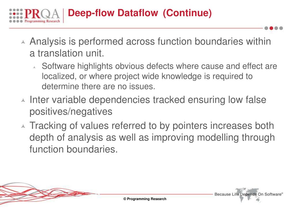 Analysis is performed across function boundaries within a translation unit. Software highlights obvious defects where cause and effect are localized, or where project wide knowledge is required to determine there are no issues. Inter variable dependencies tracked ensuring low false positives/negatives Tracking of values referred to by pointers increases both depth of analysis as well as improving modelling through function boundaries. Deep-flow Dataflow (Continue)