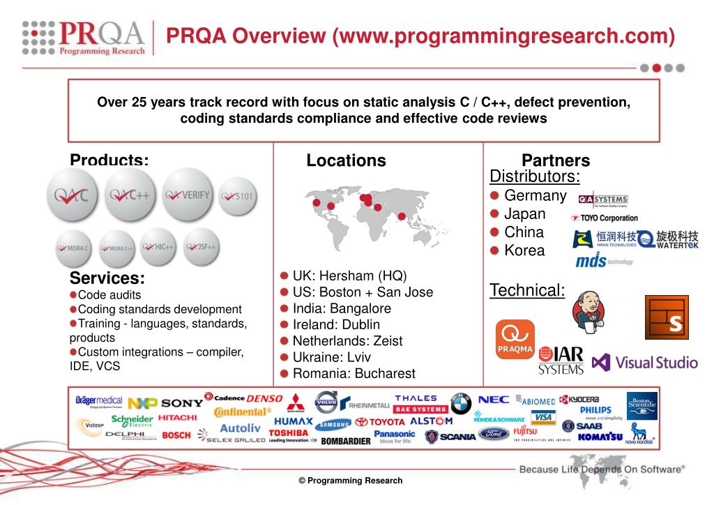 PRQA Overview (www.programmingresearch.com) Over 25 years track record with focus on static analysis C / C++, defect prevention, coding standards compliance and effective code reviews Products: Locations Partners Services: