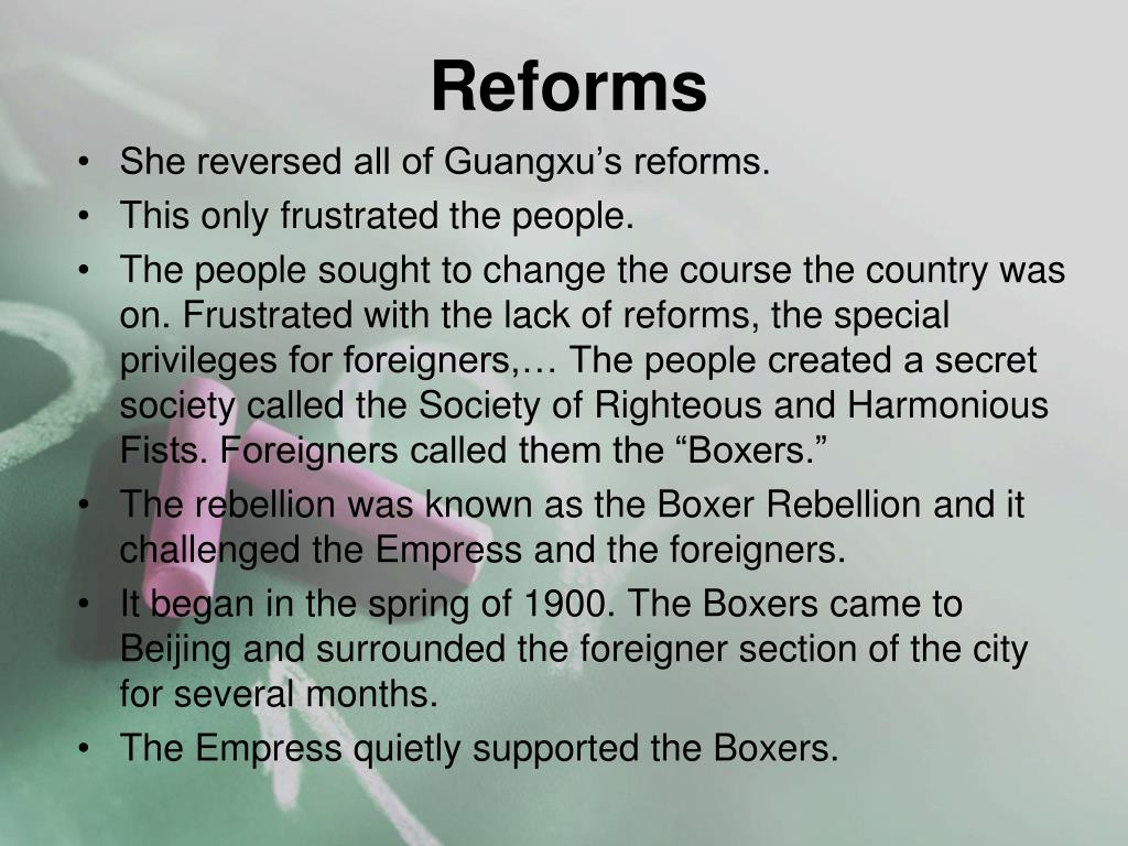Reforms • Why would the Empress support the Boxers? • Better for them to be angry at the foreigners than with her and her government. • Once the foreigner government realized their compounds were under siege they all worked together to put down the rebellion. • The rebellion failed but was seen as an important step to restore nationalism and for unity to remove the foreigners as well as make the government respond to the people’s needs. • The Empress made the unusual step to look to reform the government. Something that was happening around the world at this time too.