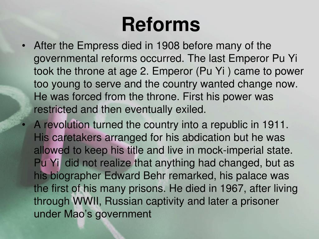 Reforms • After the Empress died in 1908 before many of the governmental reforms occurred. The last Emperor Pu Yi took the throne at age 2. Emperor (Pu Yi ) came to power too young to serve and the country wanted change now. He was forced from the throne. First his power was restricted and then eventually exiled. • A revolution turned the country into a republic in 1911. His caretakers arranged for his abdication but he was allowed to keep his title and live in mock-imperial state. Pu Yi did not realize that anything had changed, but as his biographer Edward Behr remarked, his palace was the first of his many prisons. He died in 1967, after living through WWII, Russian captivity and later a prisoner under Mao’s government