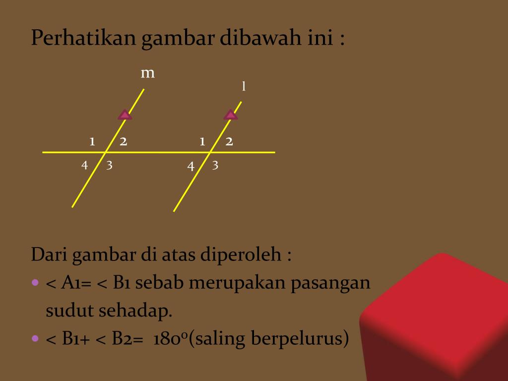 m l Perhatikangambardibawahini : Dari gambardiatasdiperoleh : • < A1= < B1 sebabmerupakanpasangan sudutsehadap. • < B1+ < B2= 1800(salingberpelurus) 1 2 1 2 4 3 4 3