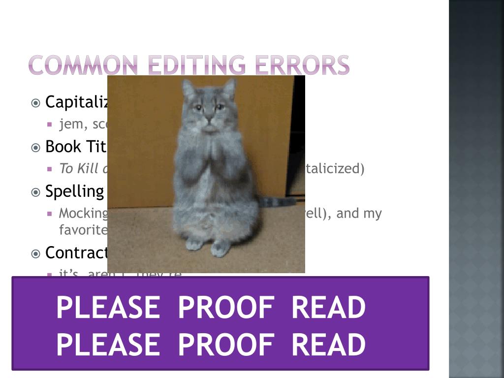 Common Editing Errors • Capitalization • jem, scout, maycomb • Book Titles • To Kill a Mockingbird (Capitalized and Italicized) • Spelling • Mocking bird (Mockingbird), Euwell(Ewell), and my favorite: “mooching bird” • Contractions • it’s, aren’t, they’re • First and Second Person • I, you, we PLEASE PROOF READ PLEASE PROOF READ