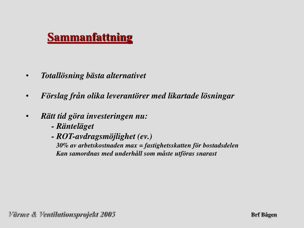 Sammanfattning • Totallösning bästa alternativet • Förslag från olika leverantörer med likartade lösningar • Rätt tid göra investeringen nu: - Ränteläget - ROT-avdragsmöjlighet (ev.) • 30% av arbetskostnaden max = fastighetsskatten för bostadsdelen • Kan samordnas med underhåll som måste utföras snarast