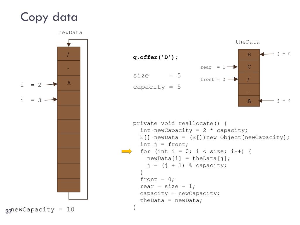 Copy data newData theData i = 4 i = 3 / B B j = 0 q.offer('D'); j = 1 + C - size = 5 front = 2 / A capacity = 5 - B A private void reallocate() { int newCapacity = 2 * capacity; E[] newData = (E[])new Object[newCapacity]; int j = front; for (int i = 0; i < size; i++) { newData[i] = theData[j]; j = (j + 1) % capacity; } front = 0; rear = size – 1; capacity = newCapacity; theData = newData; } rear = 1 newCapacity = 10