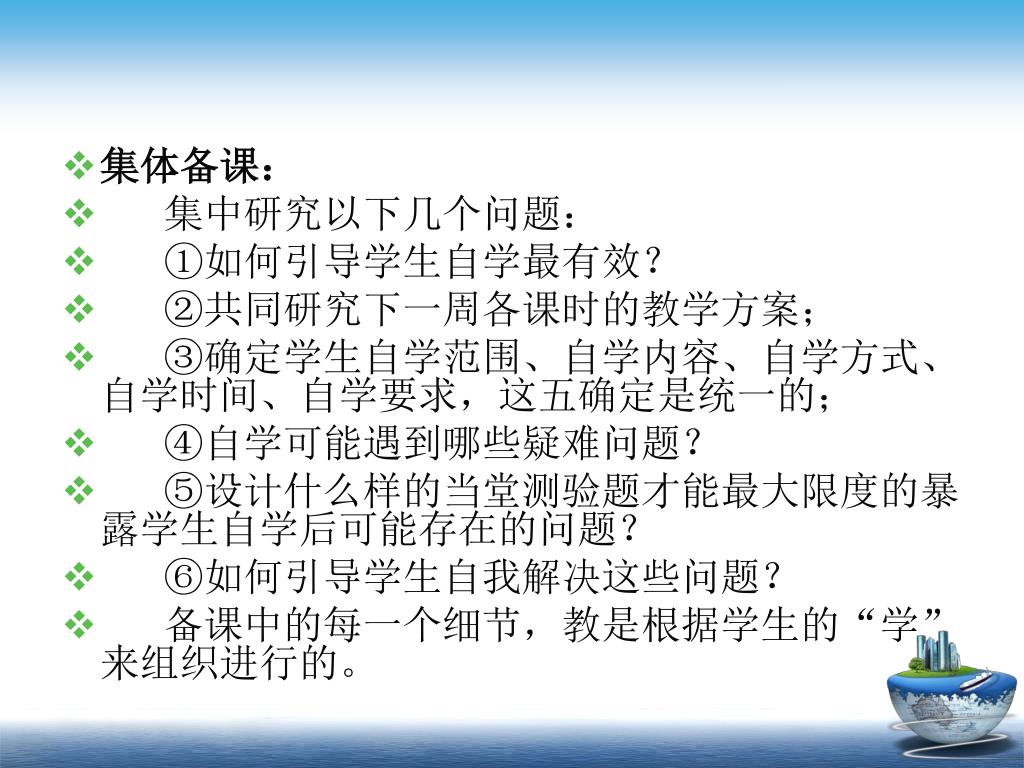 集体备课: • 集中研究以下几个问题: • ①如何引导学生自学最有效? • ②共同研究下一周各课时的教学方案; • ③确定学生自学范围、自学内容、自学方式、自学时间、自学要求,这五确定是统一的; • ④自学可能遇到哪些疑难问题? • ⑤设计什么样的当堂测验题才能最大限度的暴露学生自学后可能存在的问题? • ⑥如何引导学生自我解决这些问题? • 备课中的每一个细节,教是根据学生的“学”来组织进行的。
