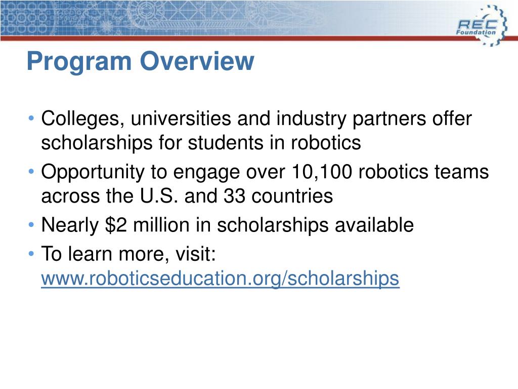 The REC Foundation Scholarship Program. July 2014. Program Overview. Colleges, universities and industry partners offer scholarships for students in robotics Opportunity to engage over 10,100 robotics teams across the U.S. and 33 countries Nearly $2 million in scholarships available