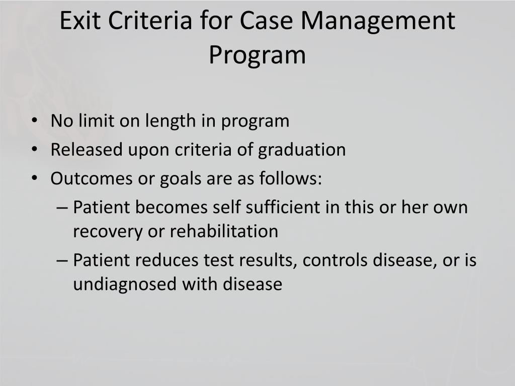 Exit Criteria for Case Management Program • No limit on length in program • Released upon criteria of graduation • Outcomes or goals are as follows: • Patient becomes self sufficient in this or her own recovery or rehabilitation • Patient reduces test results, controls disease, or is undiagnosed with disease