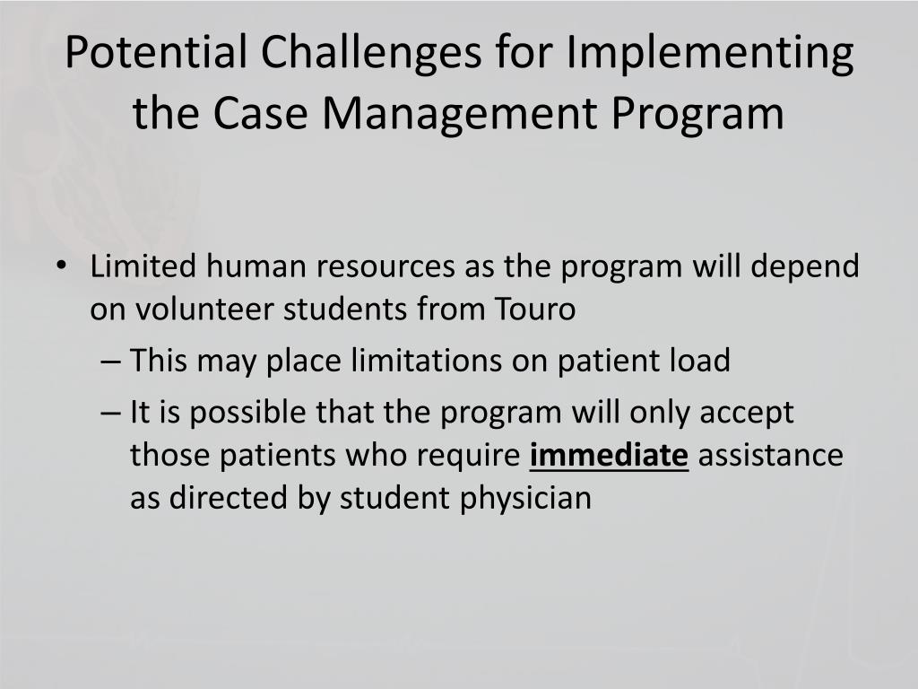 Potential Challenges for Implementing the Case Management Program • Limited human resources as the program will depend on volunteer students from Touro • This may place limitations on patient load • It is possible that the program will only accept those patients who require immediate assistance as directed by student physician