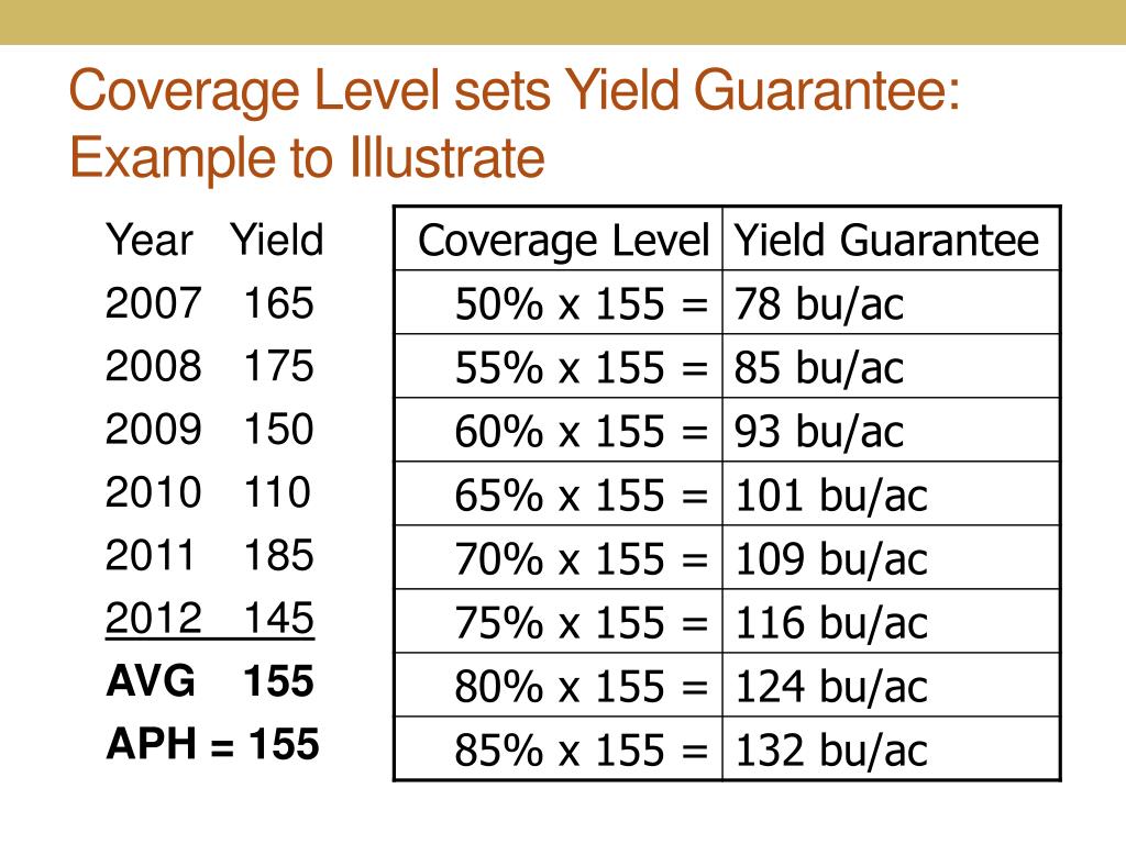 Coverage Level sets Yield Guarantee: Example to Illustrate Year Yield 2007165 2008 175 2009 150 2010 110 2011 185 2012145 AVG 155 APH = 155