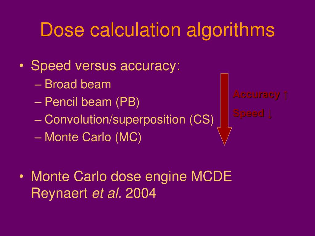 Dose calculation algorithms • Speed versus accuracy: • Broad beam • Pencil beam (PB) • Convolution/superposition (CS) • Monte Carlo (MC) • Monte Carlo dose engine MCDE Reynaert et al. 2004 Accuracy ↑ Speed ↓