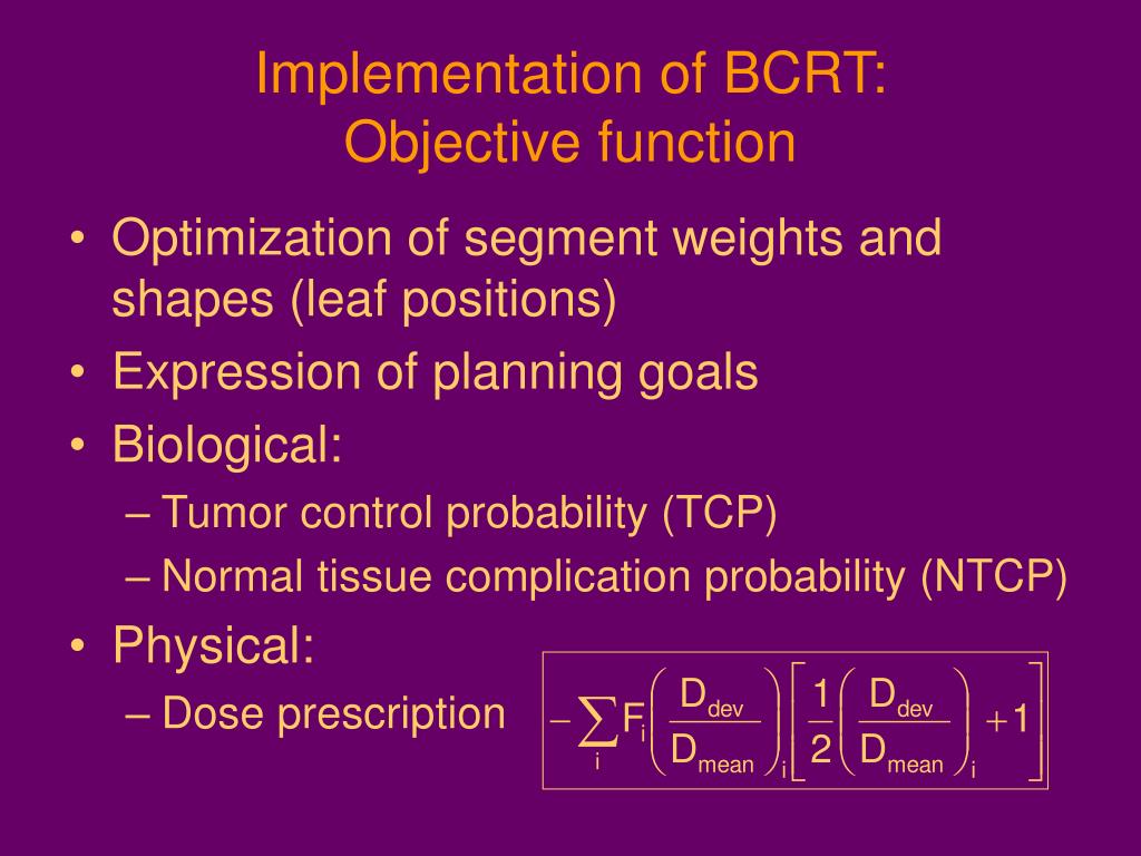 Implementation of BCRT:Objective function • Optimization of segment weights and shapes (leaf positions) • Expression of planning goals • Biological: • Tumor control probability (TCP) • Normal tissue complication probability (NTCP) • Physical: • Dose prescription