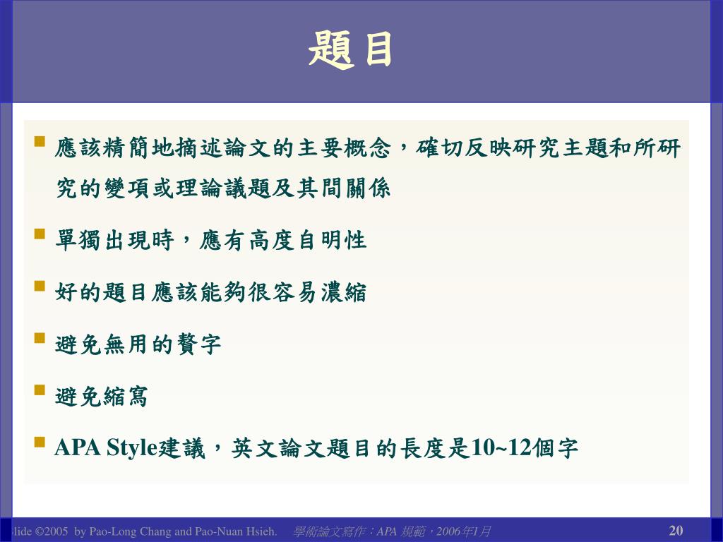 題目 • 應該精簡地摘述論文的主要概念,確切反映研究主題和所研究的變項或理論議題及其間關係 • 單獨出現時,應有高度自明性 • 好的題目應該能夠很容易濃縮 • 避免無用的贅字 • 避免縮寫 • APA Style建議,英文論文題目的長度是10~12個字