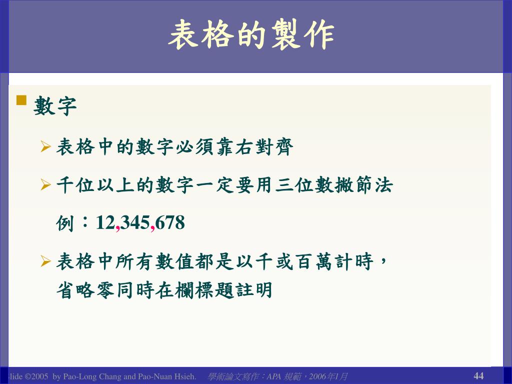 表格的製作 • 數字 • 表格中的數字必須靠右對齊 • 千位以上的數字一定要用三位數撇節法 例:12,345,678 • 表格中所有數值都是以千或百萬計時,省略零同時在欄標題註明