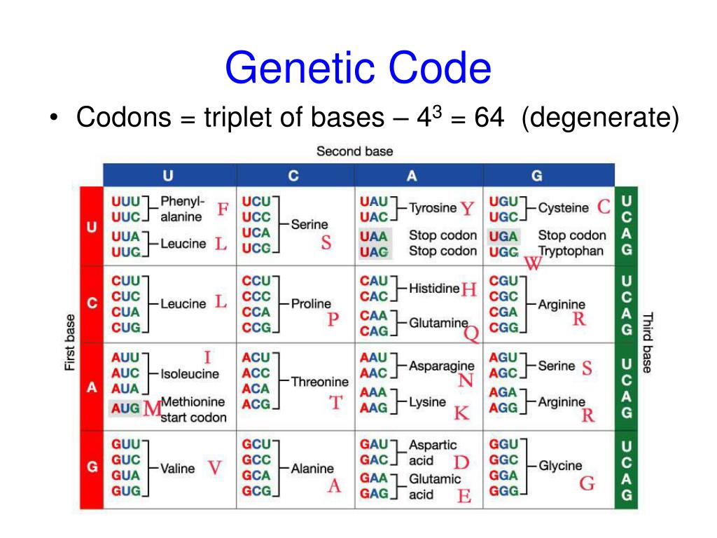 Genetic Code • Codons = triplet of bases – 43 = 64 (degenerate)