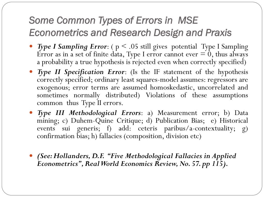 Some Common Types of Errors in MSE Econometrics and Research Design and Praxis • Type I Sampling Error: ( p < .05 still gives potential Type I Sampling Error as in a set of finite data, Type I error cannot ever = 0, thus always a probability a true hypothesis is rejected even when correctly specified) • Type II Specification Error: (Is the IF statement of the hypothesis correctly specified; ordinary least squares-model assumes: regressors are exogenous; error terms are assumed homoskedastic, uncorrelated and sometimes normally distributed) Violations of these assumptions common thus Type II errors. • Type III Methodological Errors: a) Measurement error; b) Data mining; c) Duhem-Quine Critique; d) Publication Bias; e) Historical events sui generis; f) add: ceteris paribus/a-contextuality; g) confirmation bias; h) fallacies (composition, division etc) • (See: Hollanders, D.F. “Five Methodological Fallacies in Applied Econometrics”, Real World Economics Review, No. 57. pp 115).
