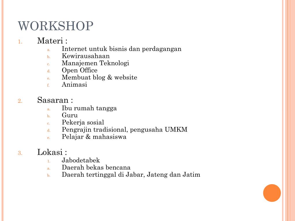 WORKSHOP • Materi : • Internet untuk bisnis dan perdagangan • Kewirausahaan • Manajemen Teknologi • Open Office • Membuat blog & website • Animasi • Sasaran : • Ibu rumah tangga • Guru • Pekerja sosial • Pengrajin tradisional, pengusaha UMKM • Pelajar & mahasiswa • Lokasi : • Jabodetabek • Daerah bekas bencana • Daerah tertinggal di Jabar, Jateng dan Jatim