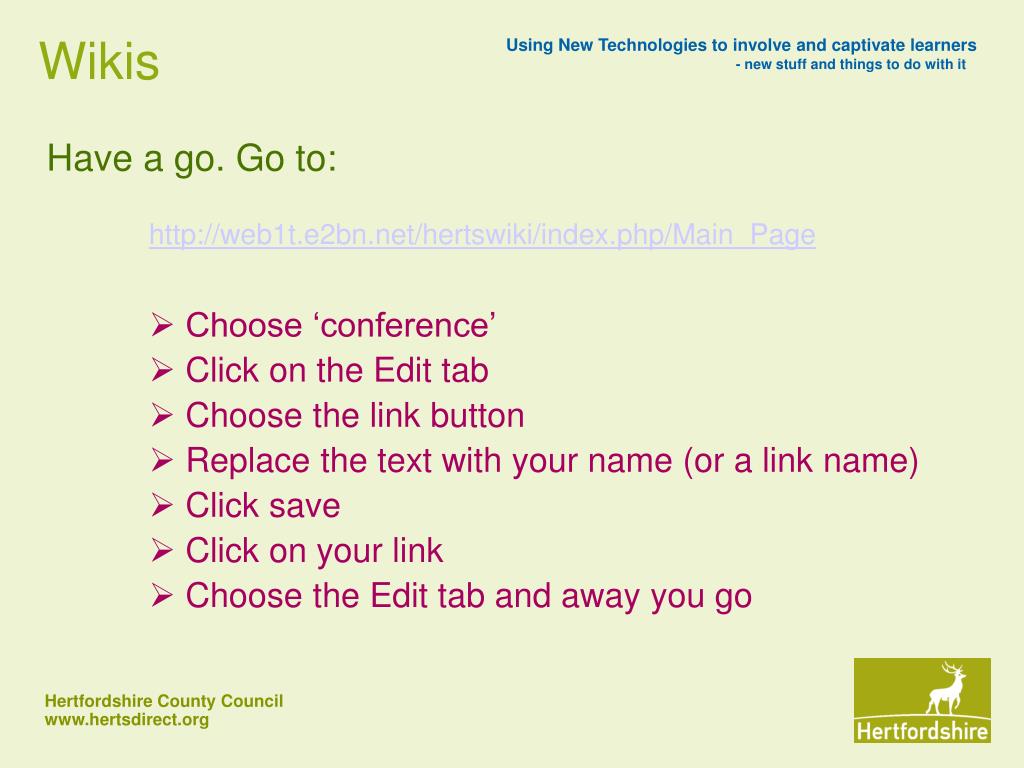 Wikis 0 • Have a go. Go to: http://web1t.e2bn.net/hertswiki/index.php/Main_Page • Choose ‘conference’ • Click on the Edit tab • Choose the link button • Replace the text with your name (or a link name) • Click save • Click on your link • Choose the Edit tab and away you go