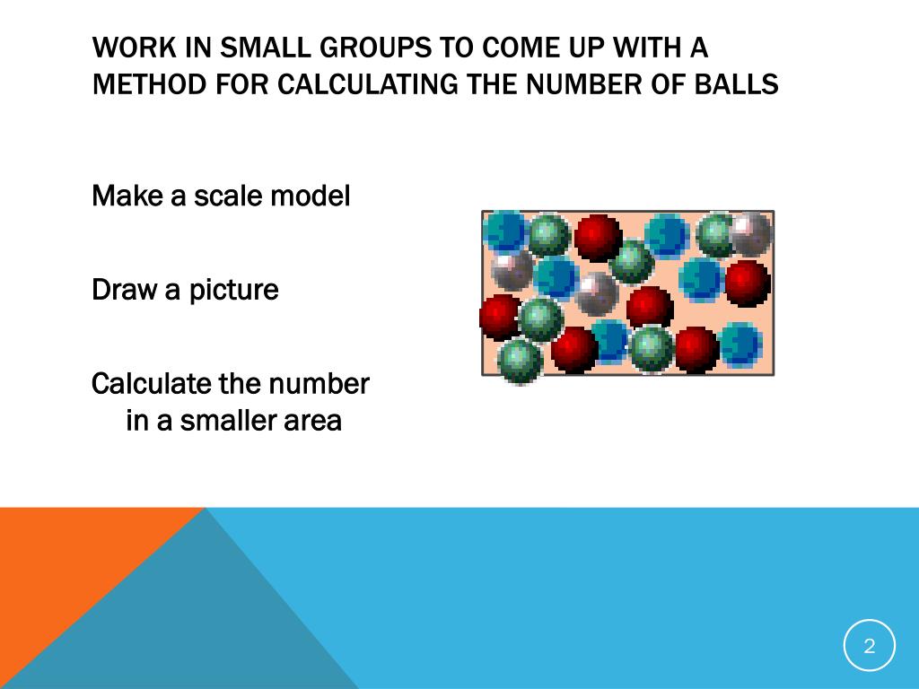Work in small groups to come up with a method for calculating the number of balls • Make a scale model • Draw a picture • Calculate the number in a smaller area