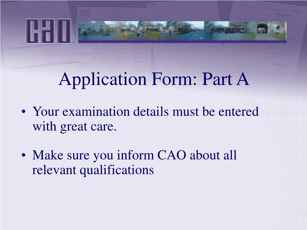 Application Form: Part A • Your examination details must be entered with great care. • Make sure you inform CAO about all relevant qualifications