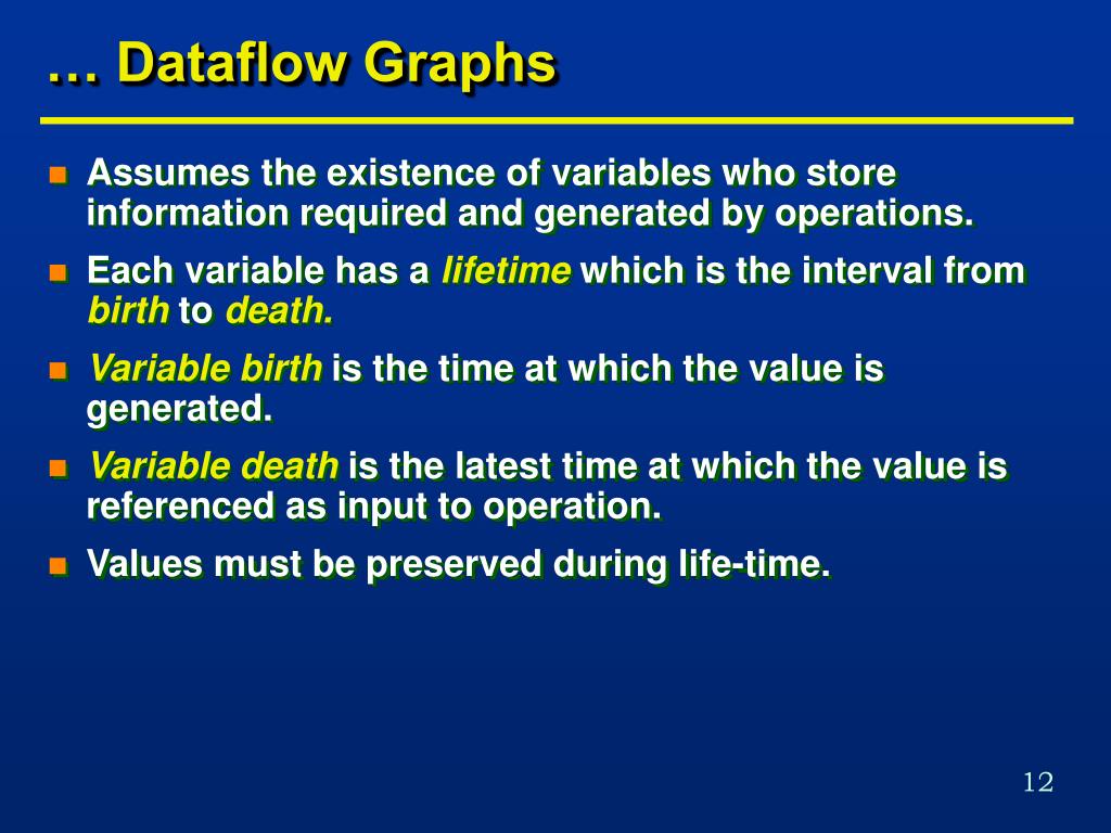 … Dataflow Graphs • Assumes the existence of variables who store information required and generated by operations. • Each variable has a lifetime which is the interval from birth to death. • Variable birth is the time at which the value is generated. • Variable death is the latest time at which the value is referenced as input to operation. • Values must be preserved during life-time.