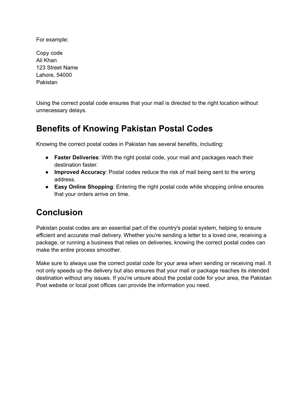 For example: Copy code Ali Khan 123 Street Name Lahore, 54000 Pakistan Using the correct postal code ensures that your mail is directed to the right location without unnecessary delays. Benefits of Knowing Pakistan Postal Codes Knowing the correct postal codes in Pakistan has several benefits, including: ● Faster Deliveries: With the right postal code, your mail and packages reach their destination faster. Improved Accuracy: Postal codes reduce the risk of mail being sent to the wrong address. Easy Online Shopping: Entering the right postal code while shopping online ensures that your orders arrive on time. ● ● Conclusion Pakistan postal codes are an essential part of the country's postal system, helping to ensure efficient and accurate mail delivery. Whether you're sending a letter to a loved one, receiving a package, or running a business that relies on deliveries, knowing the correct postal codes can make the entire process smoother. Make sure to always use the correct postal code for your area when sending or receiving mail. It not only speeds up the delivery but also ensures that your mail or package reaches its intended destination without any issues. If you're unsure about the postal code for your area, the Pakistan Post website or local post offices can provide the information you need.
