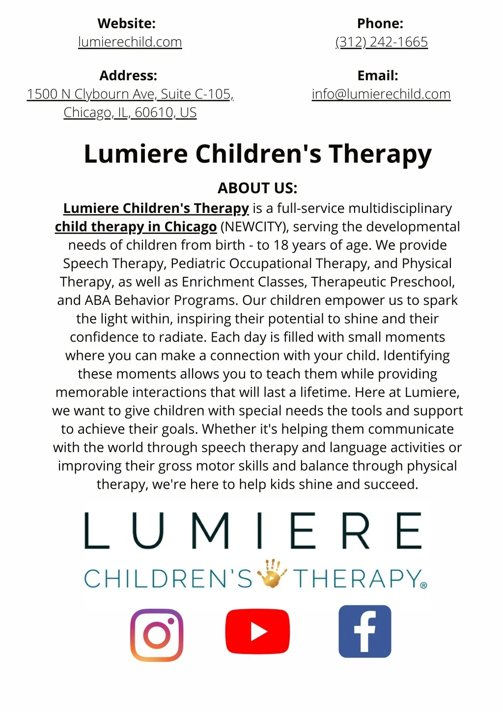 Website: lumierechild.com Phone: (312) 242-1665 Address: Email: 1500 N Clybourn Ave, Suite C-105, Chicago, IL, 60610, US Lumiere Children's Therapy info@lumierechild.com ABOUT US: Lumiere Children's Therapy is a full-service multidisciplinary child therapy in Chicago (NEWCITY), serving the developmental needs of children from birth - to 18 years of age. We provide Speech Therapy, Pediatric Occupational Therapy, and Physical Therapy, as well as Enrichment Classes, Therapeutic Preschool, and ABA Behavior Programs. Our children empower us to spark the light within, inspiring their potential to shine and their confidence to radiate. Each day is filled with small moments where you can make a connection with your child. Identifying these moments allows you to teach them while providing memorable interactions that will last a lifetime. Here at Lumiere, we want to give children with special needs the tools and support to achieve their goals. Whether it's helping them communicate with the world through speech therapy and language activities or improving their gross motor skills and balance through physical therapy, we're here to help kids shine and succeed.