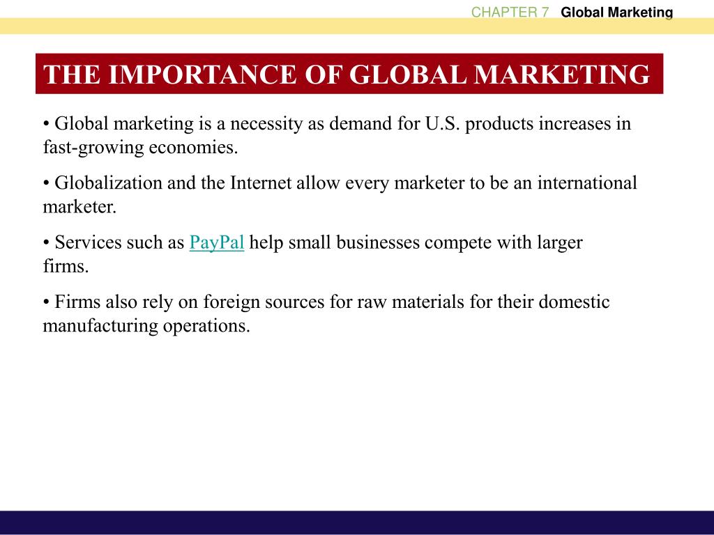 THE IMPORTANCE OF GLOBAL MARKETING • Global marketing is a necessity as demand for U.S. products increases in fast-growing economies. • Globalization and the Internet allow every marketer to be an international marketer. • Services such as PayPal help small businesses compete with larger firms. • Firms also rely on foreign sources for raw materials for their domestic manufacturing operations.
