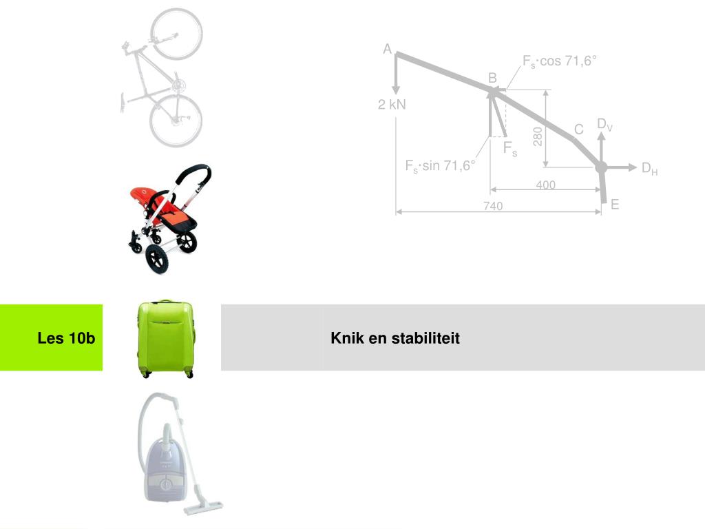 A Fs·cos 71,6° B 2 kN DV C 280 Fs Fs·sin 71,6° DH 400 E 740 Les 10b Knik en stabiliteit les 10