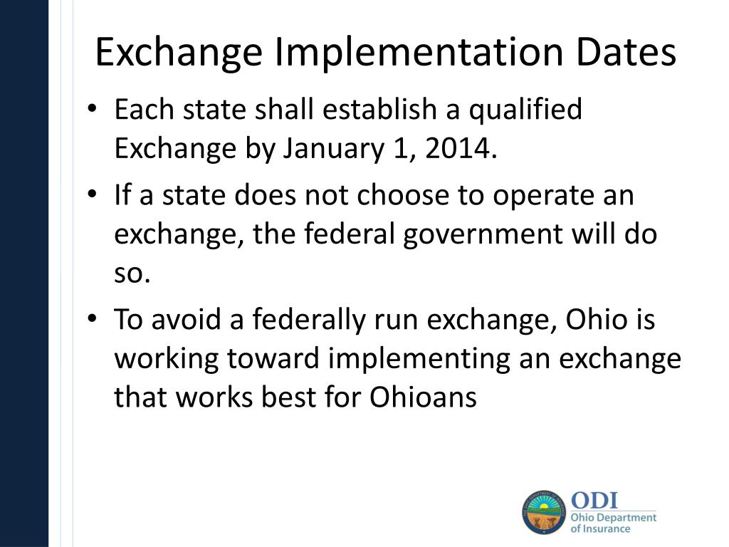 Exchange Implementation Dates • Each state shall establish a qualified Exchange by January 1, 2014. • If a state does not choose to operate an exchange, the federal government will do so. • To avoid a federally run exchange, Ohio is working toward implementing an exchange that works best for Ohioans