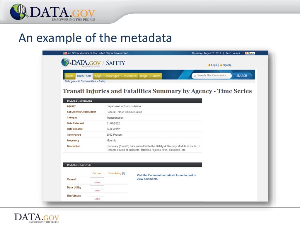 Safety.Data.Gov • It is an Administration-wide effort to increase awareness of and deepen insights into our Nation’s public safety activities by bringing together data around public safetyissues • This single resource will enable innovators to extract and correlate data in ways that will help the public and industry to make well-informed data-driven decisions • It was launched in May 2012 with a “Back of the Napkin” Data Dive – results available in September • The latest “community” of the Data.Gov series