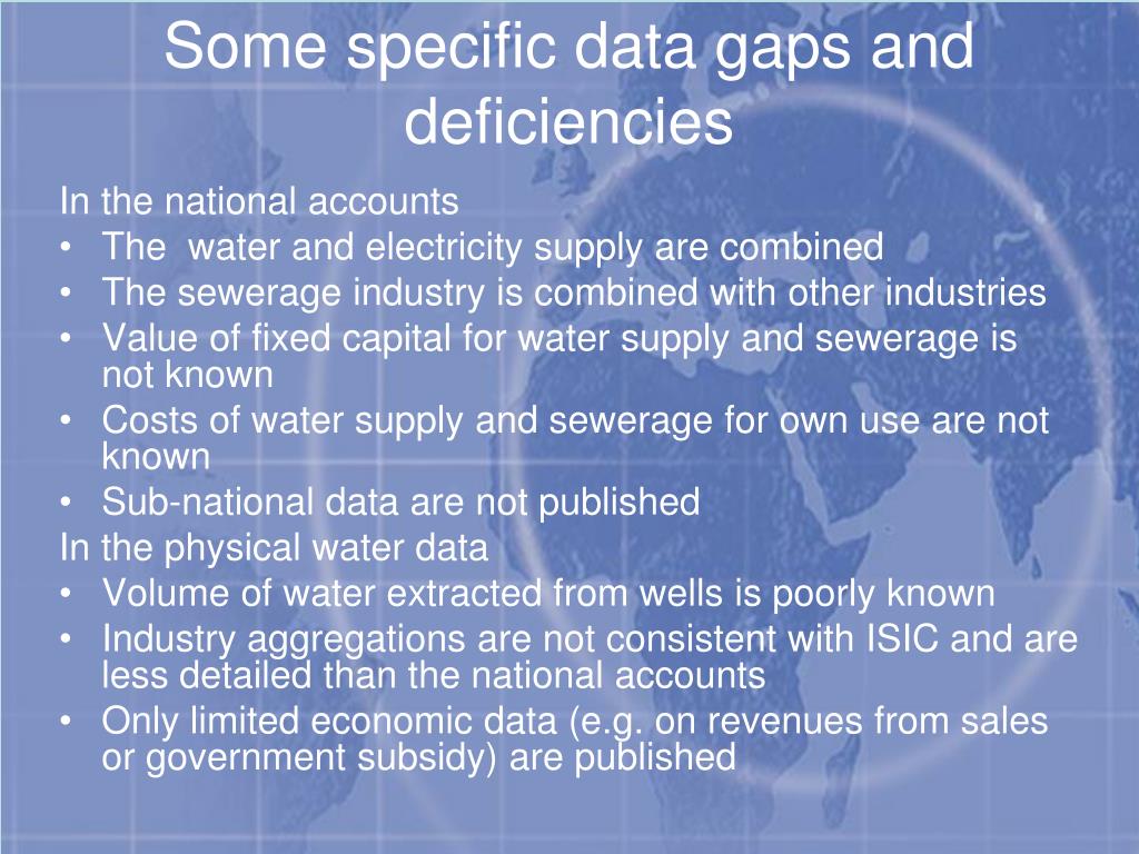 Some specific data gaps and deficiencies In the national accounts The water and electricity supply are combined The sewerage industry is combined with other industries Value of fixed capital for water supply and sewerage is not known Costs of water supply and sewerage for own use are not known Sub-national data are not published In the physical water data Volume of water extracted from wells is poorly known Industry aggregations are not consistent with ISIC and are less detailed than the national accounts Only limited economic data (e.g. on revenues from sales or government subsidy) are published